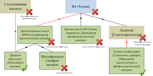 1) Прекурсори. Ацетилхолін синтезується в цитоплазмі закінчень холінергічних нейронів. Утворюється він з холіну, який ми вже зустрічали під виглядом вітаміну B4, безпосередній його прийом погоди не робить, тому перейдемо до більш ефективних засобів.