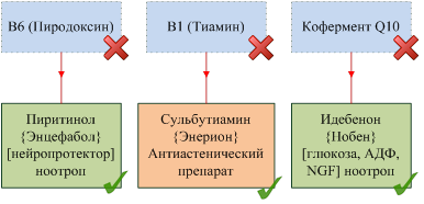 1) Піритинол {Енцефабол} [нейропротектор, ноотроп]. Піридоксин 2.0 в прямому сенсі слова - подвоєна молекула піридоксину (вітаміну B6), що містить дисульфідних місток (дисульфід піридоксину). Підвищує захоплення і утилізацію глюкози, синтез ГАМК, метаболізм нуклеїнових кислот і вивільнення ацетилхоліну в синапсах нервових клітин, покращує холінергічну передачу в нервовій тканині, сприяє стабілізації структури клітинних мембран нейронів і їх функції за рахунок пригнічення лізосомальнихферментів, запобігаючи тим самим утворення вільних радикалів. Має набір протипоказань, з якими треба ознайомитися, коштує 11 рублів за таблетку. Беремо.