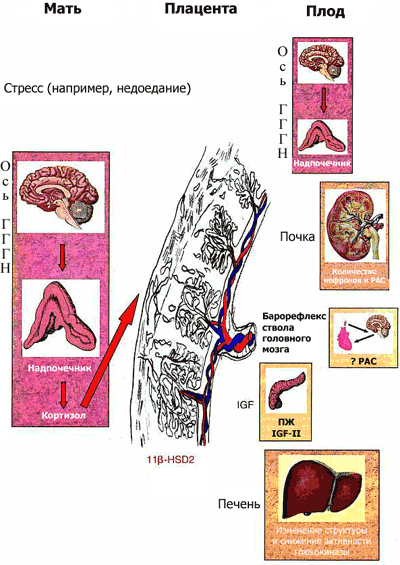 Мал. 1 Потенційні механізми "програмування плода" Стрес материнського організму (наприклад, недоїдання під час вагітності) призводить до активації осі гіпокамп-гіпоталамус-гіпофіз-надниркові залози (ГГГН) у вагітної, що, в свою чергу, в залежності від рівня активності ферменту плаценти, яка інактивує кортикостероїди (11 -гідроксістероіддегідрогенази 2-го типу, 11 HSD-2), призводить до впливу на плід високих концентрацій глюкокортикоїдів (ГК). Високий рівень глюкокортикоїдів в крові плода сприяє зміні числа стероїдних рецепторів в ГГГН системі, змінює рівень активності інших функціональних систем (гормон росту / інсулін-залежний фактор росту, ренін-ангіотензинової системи, викликає заміщення клітин підшлункової залози плода клітинами, характерними для дорослого організму ), що в кінцевому підсумку призводить до патологічних змін в дорослому віці. IGF II: інсуліноподібний фактор росту II; РАС: ренін-ангіотензинової системи; ПЖ: підшлункова залоза. До 1996 року взаємозв'язок між патологією серцево-судинної системи в дорослому віці і низькою вагою при народженні була виявлена в 34 дослідженнях, що охоплюють більш, ніж 60 000 спостережень. У роботах, що проводяться Barker і колегами, наводяться дані про те, що у людей, що народилися з масою тіла менше 2,5 кг, у віці 50 років і старше частота пульсу в спокої вище, ніж у людей, що важили при народженні 3,3 кг и більше. Це інтерпретувалося, як доказ впливу підвищеної активності симпатичної нервової системи, запрограмоване в періоді внутрішньоутробного розвитку. Також було показано, що навіть при наявності в спокої нормального розкиду значень кортизолу плазми, найвищі значення відзначаються у людей, що мають при народженні найнижчу масу тіла. Подібна взаємозв'язок була встановлена і відносно значень систолічного артеріального тиску, рівня тригліцеридів плазми, ступеня інсулінорезистентності.