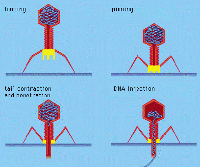 Підлітаючи (або скоріше "підпливаючи") до грубої і непривітною поверхні бактерії, він здійснює посадку, використовуючи опори. Потім висуває бур, що знаходиться в довгому "тілі", і пробиває оболонку клітини. З цього полому всередині буру бактеріофаг "впорскує" свою спіраль ДНК всередину клітини.